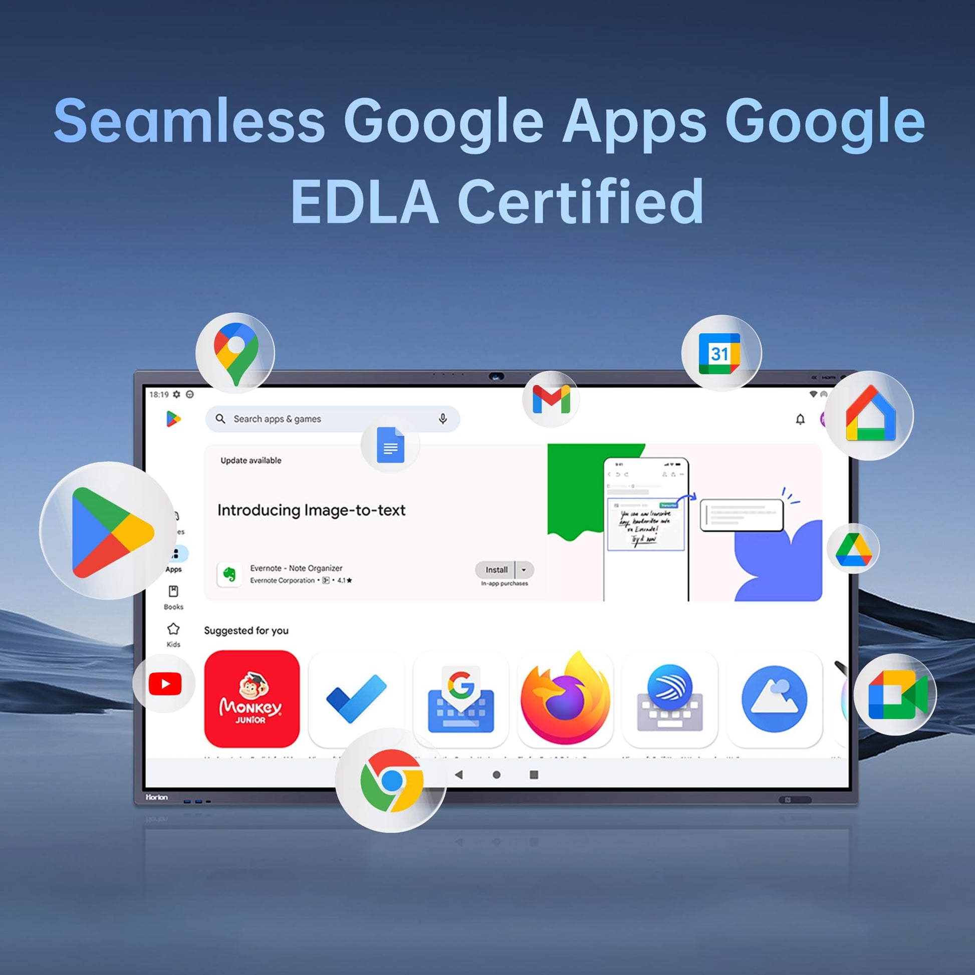 - 【Android 13 & Google Play】: The smooth animation engine and multitasking capabilities of Android 13 enable the whiteboard to run multiple applications simultaneously, such as teaching courseware, conference software, and real-time annotation tools, with silky-smooth operation and no lag. It provides direct access apps on Google Play, allowing one-click download of adapted interactive teaching apps (such as Nearpod and Kahoot!) and conference collaboration tools (such as Zoom and Microsoft Teams), which can run natively without additional adaptation.